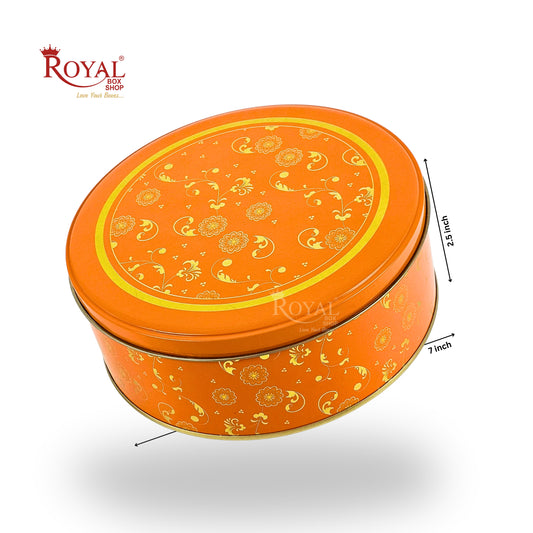 Premium Tin Box I 7"x2.5" Inches I Orange With Golden Print I Perfect for Diwali Gift, Return favor, Hamper Box, Storage