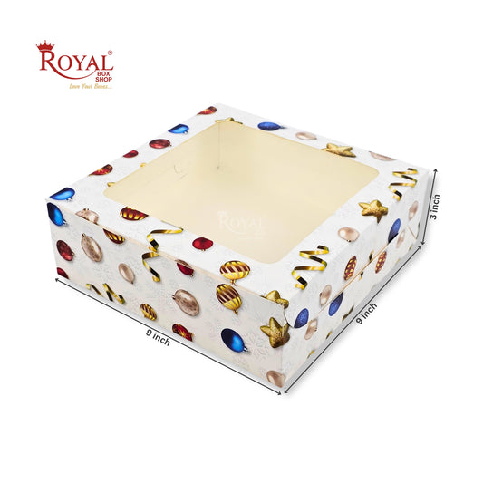 Christmas Theme Dry Cake Box With Window | 9x9x3 inch | White | For Cakes, Dry Cakes, Chocolates, Cookies, Muffins