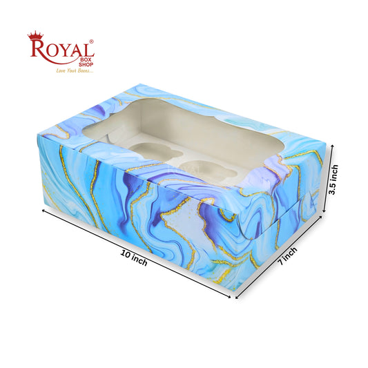 6pc Cupcake Box With Window | 10x7x3.5 Inch | Blue Marble Print | FBB
