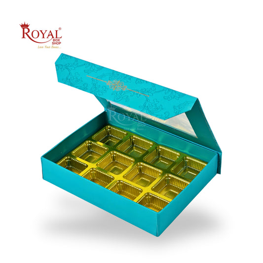 12 Cavity Rigid Chocolate Boxes With Window | Magnetic Flap | Blue with Gold Foiling | 7.5 X 5.5 X 1.5 Inch | Kappa Boxes