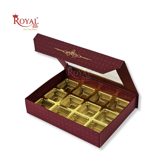 12 Cavity Rigid Chocolate Boxes With Window | Magnetic Flap | Maroon with Gold Foiling | 7.5 X 5.5 X 1.5 Inch | Kappa Boxes