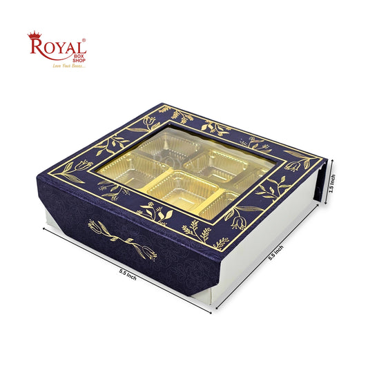 9 Cavity Rigid Chocolate Box With Window | Magnetic Flap | Blue with Gold Foiling | 5.5x5.5x1.5 Inch