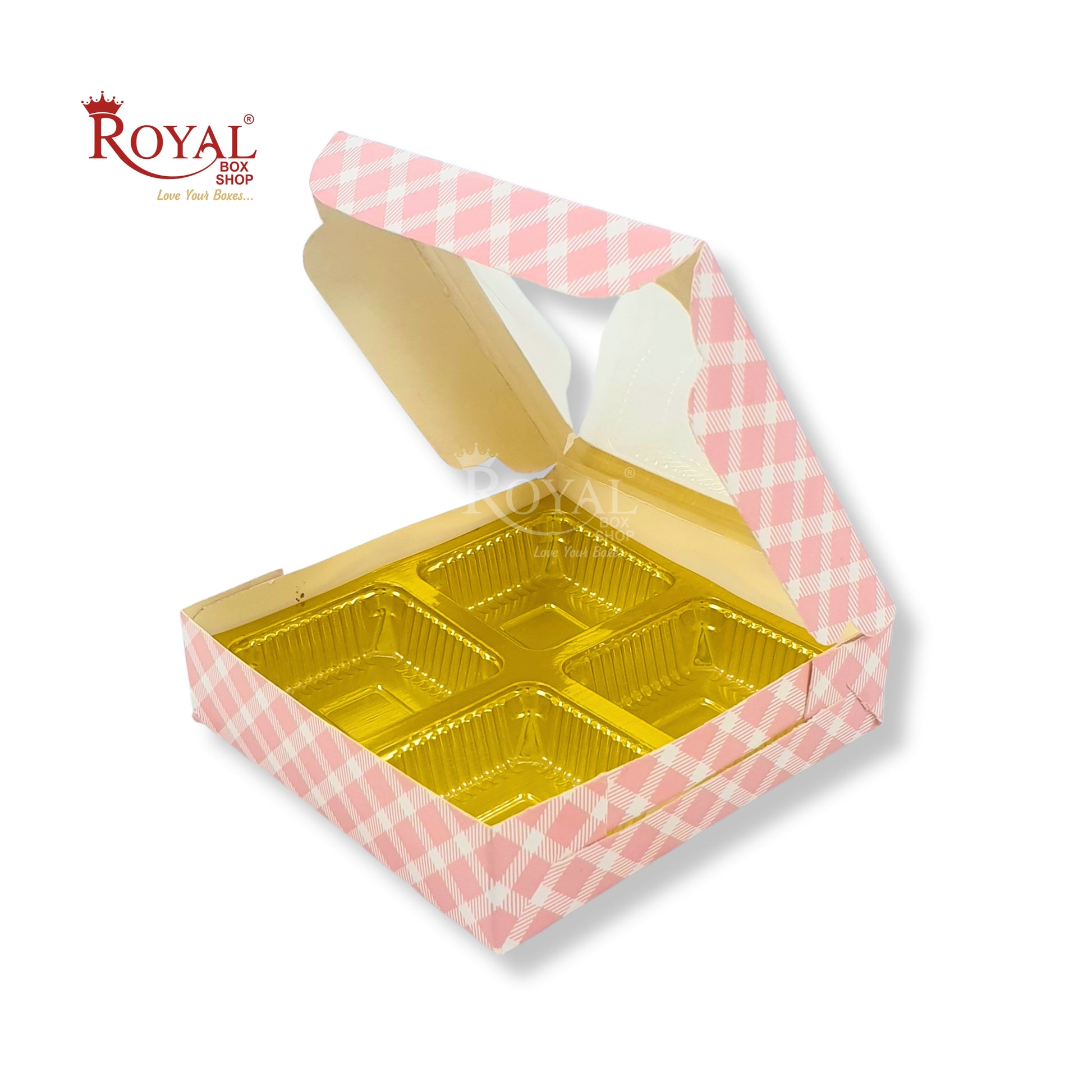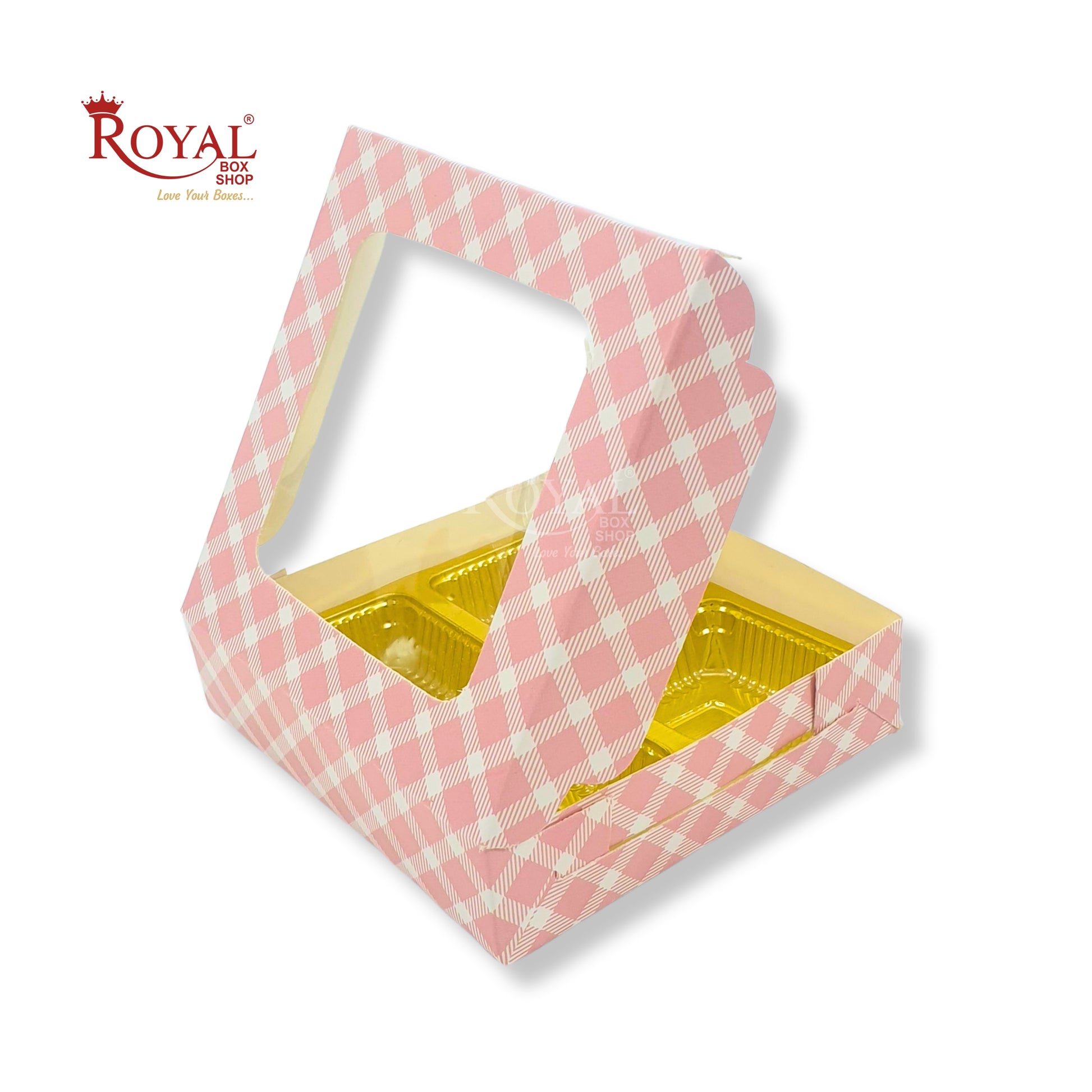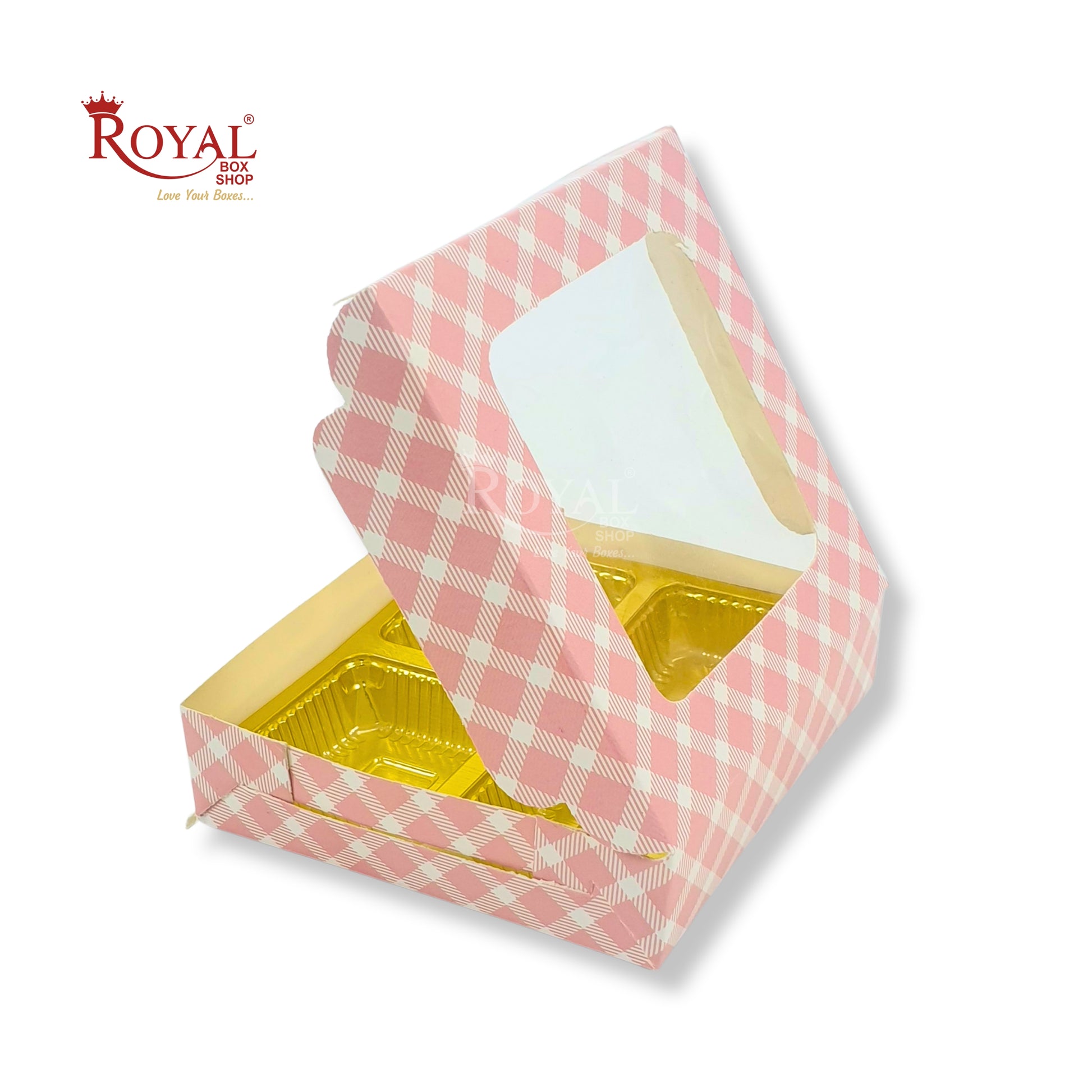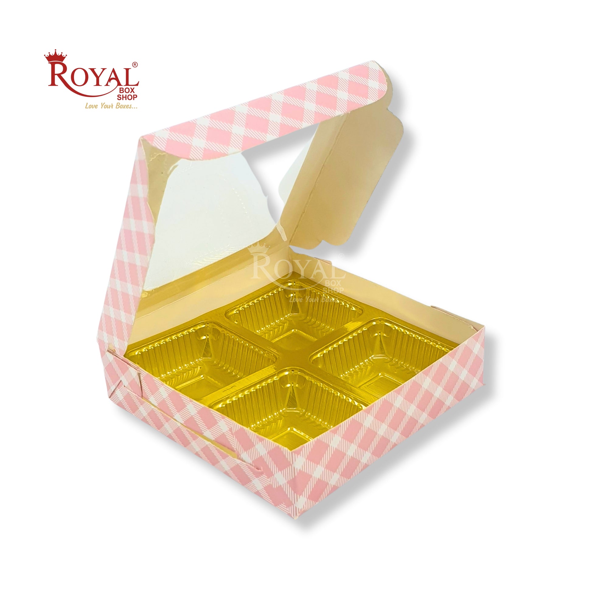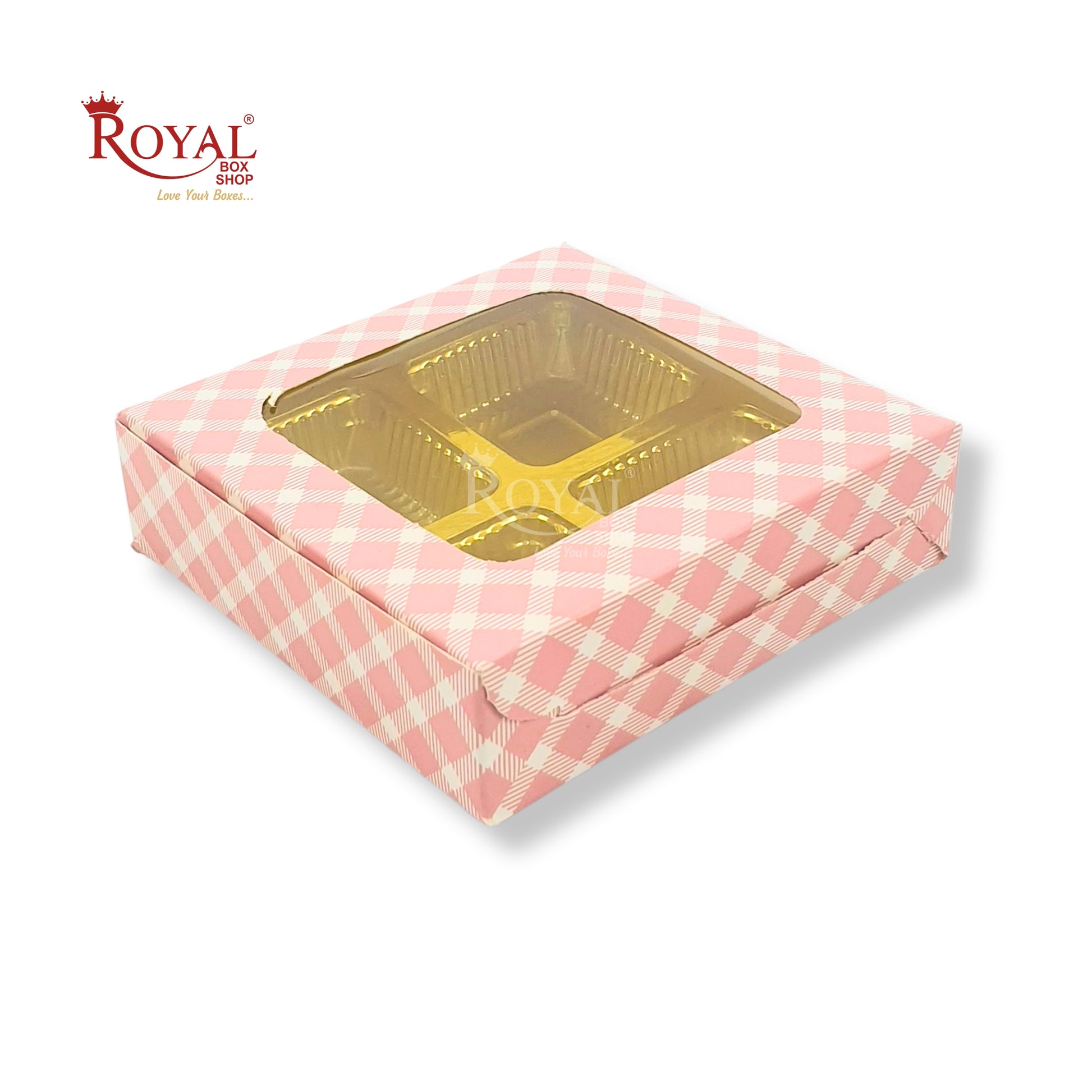 4 Cavity Chocolate Boxes with Window I 3.75 x 3.75 x 1 inches I Pink Check