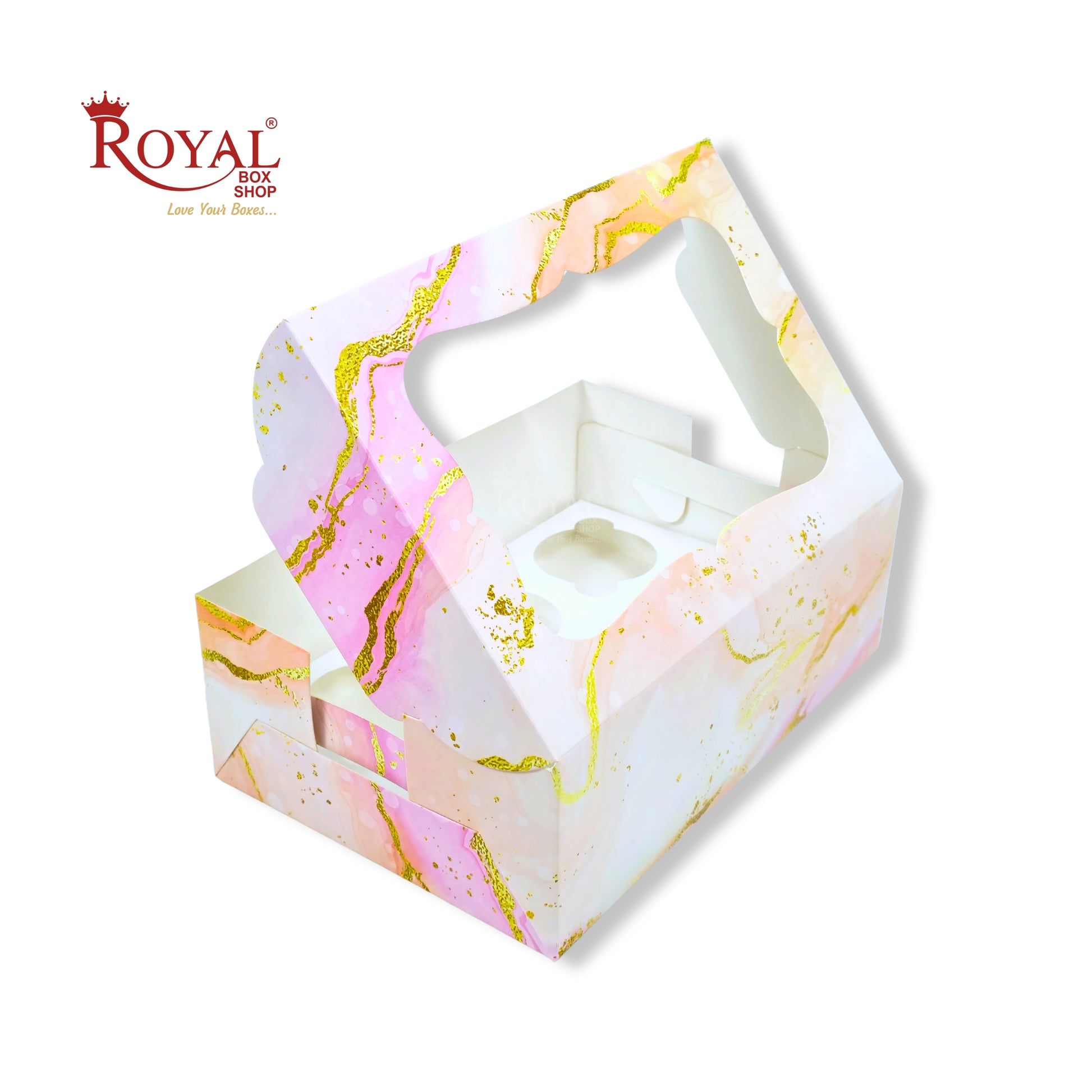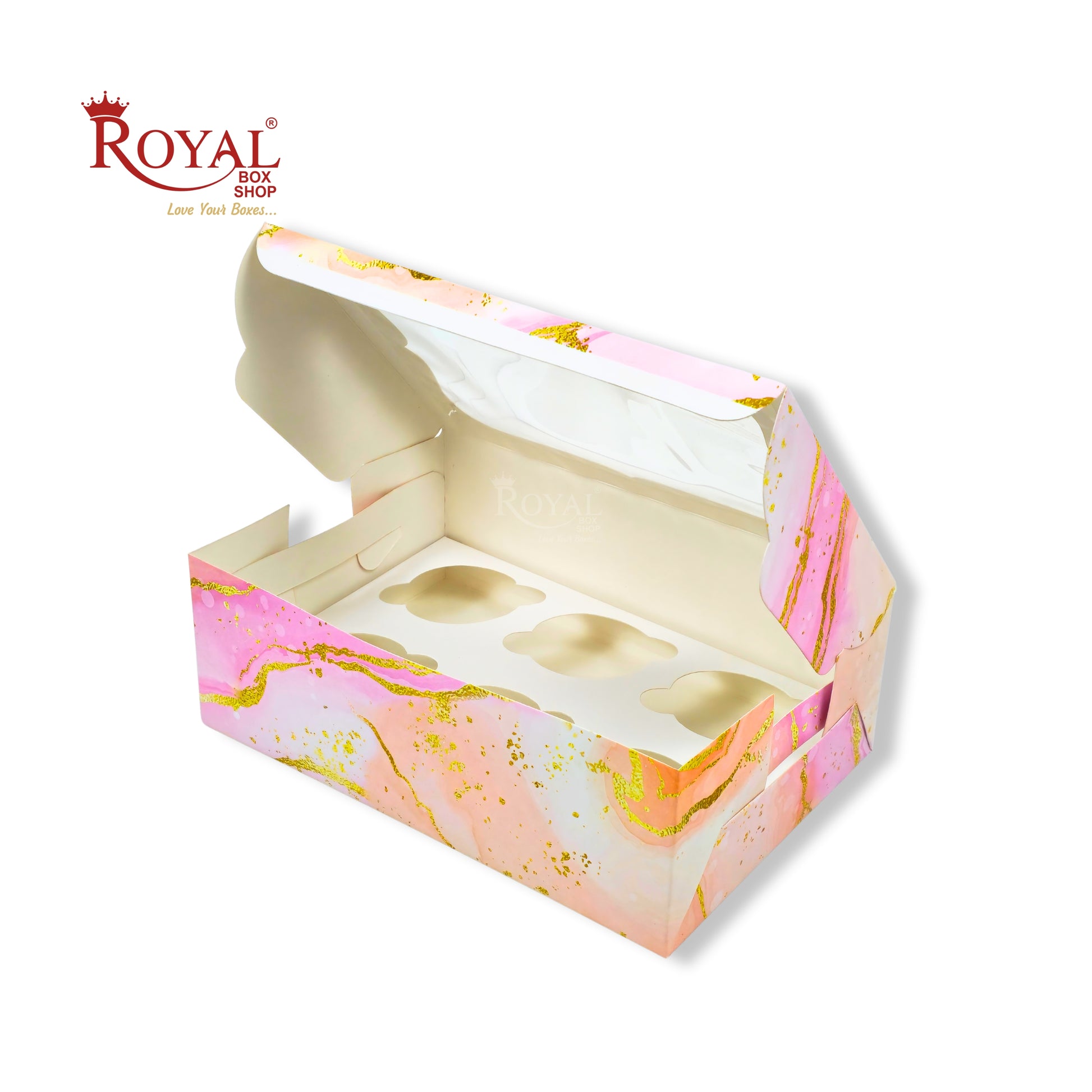 6pc Cupcake Box With Window | 10x7x3.5 Inch | Pink Marble Print | FBB