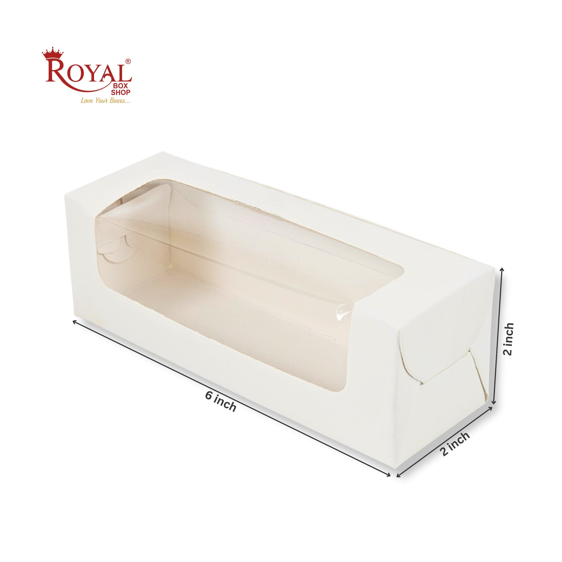 - The perfect solution for your sweet treats! These boxes come with a clear plastic window and are perfect to showcase your homemade and store-bought macarons. This macaron box is also suitable for small desserts, mini cupcakes, cookies and candy With a sleek White and compact 6x2x2 inches size, they're perfect for any occasion, including special occasions, birthdays, anniversaries, baby showers, home parties, invitations, return gifts, and small parties.