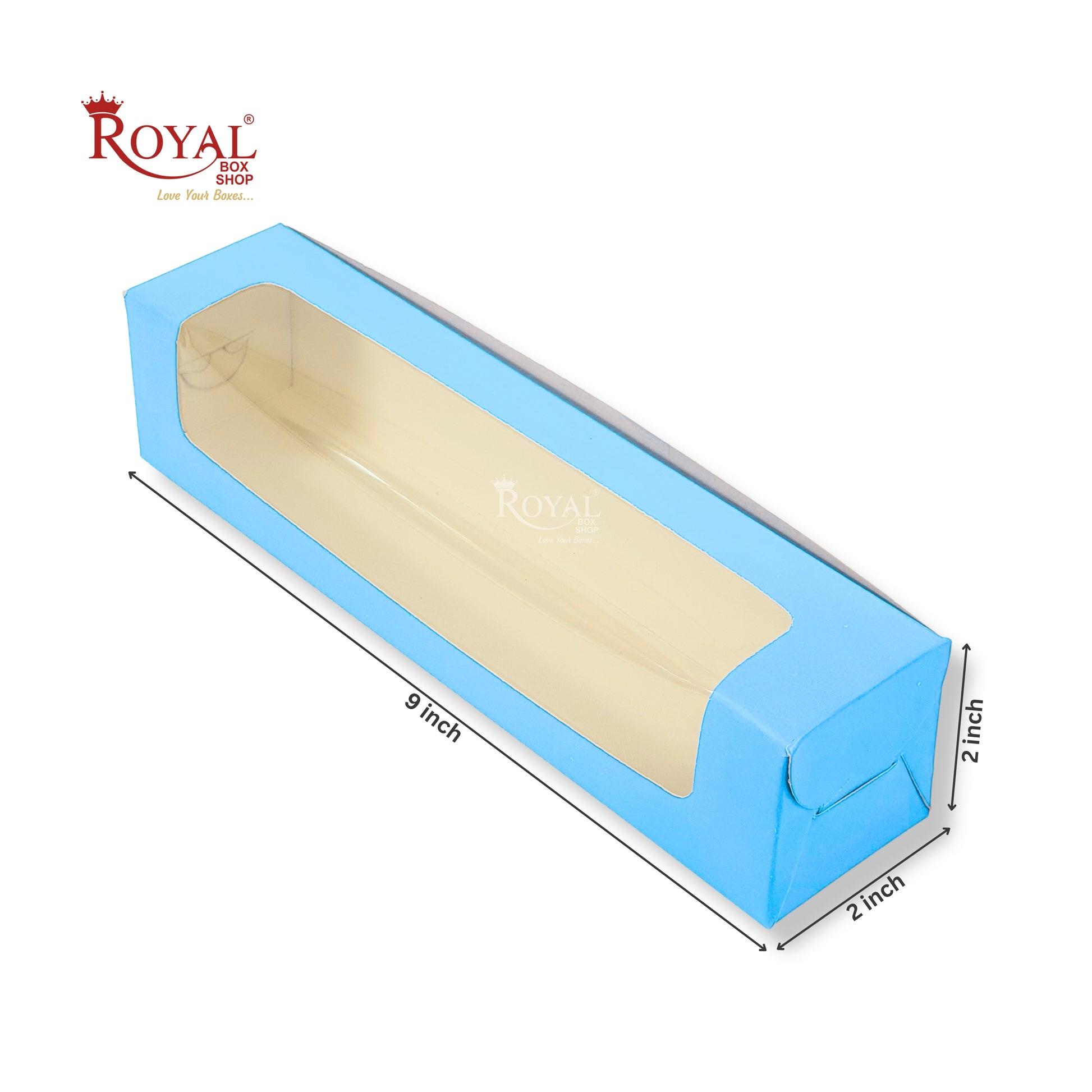 - The perfect solution for your sweet treats! These boxes come with a clear plastic window and are perfect to showcase your homemade and store-bought macarons. This macaron box is also suitable for small desserts, mini cupcakes, cookies and candy With a sleek blue and compact 9x2x2 inches size, they're perfect for any occasion, including special occasions, birthdays, anniversaries, baby showers, home parties, invitations, return gifts, and small parties.
