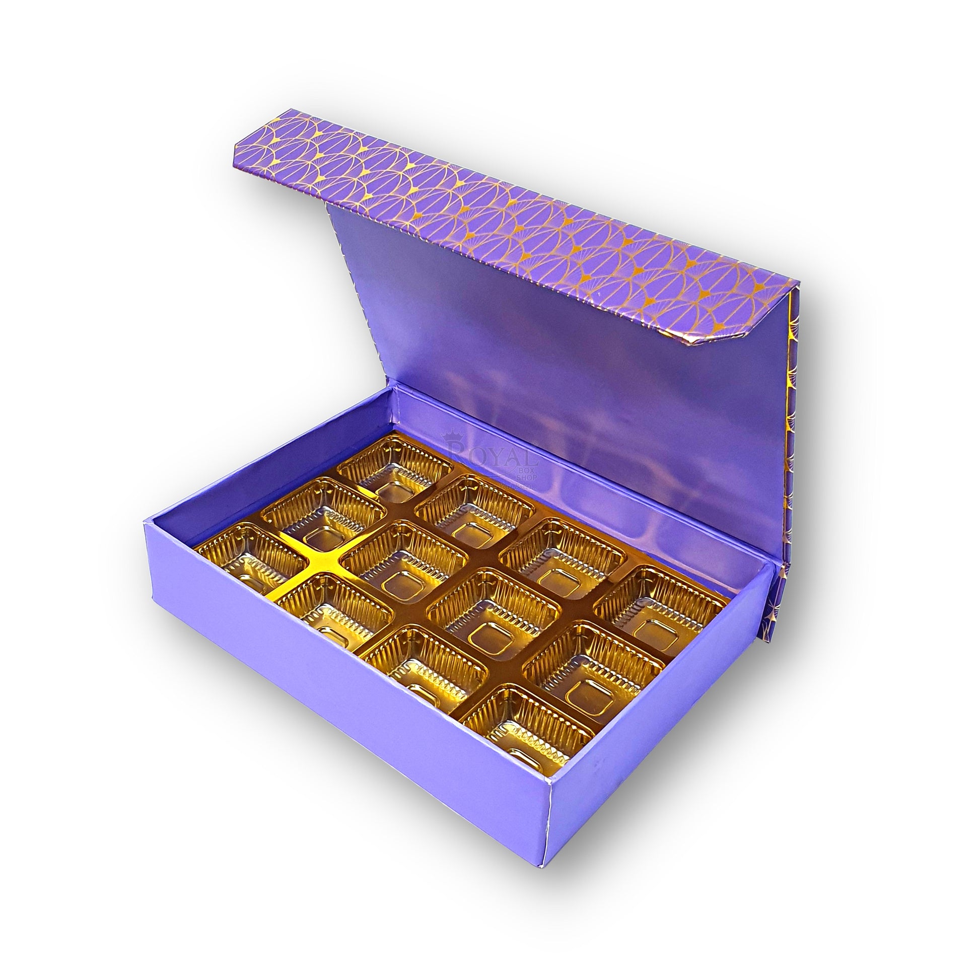 Rigid Chocolate Boxes 12 Cavity With Magnetic Flap I Purple with Gold Foiling I 7.5 X 5.5 X 1.5 Inch I Kappa Boxes
