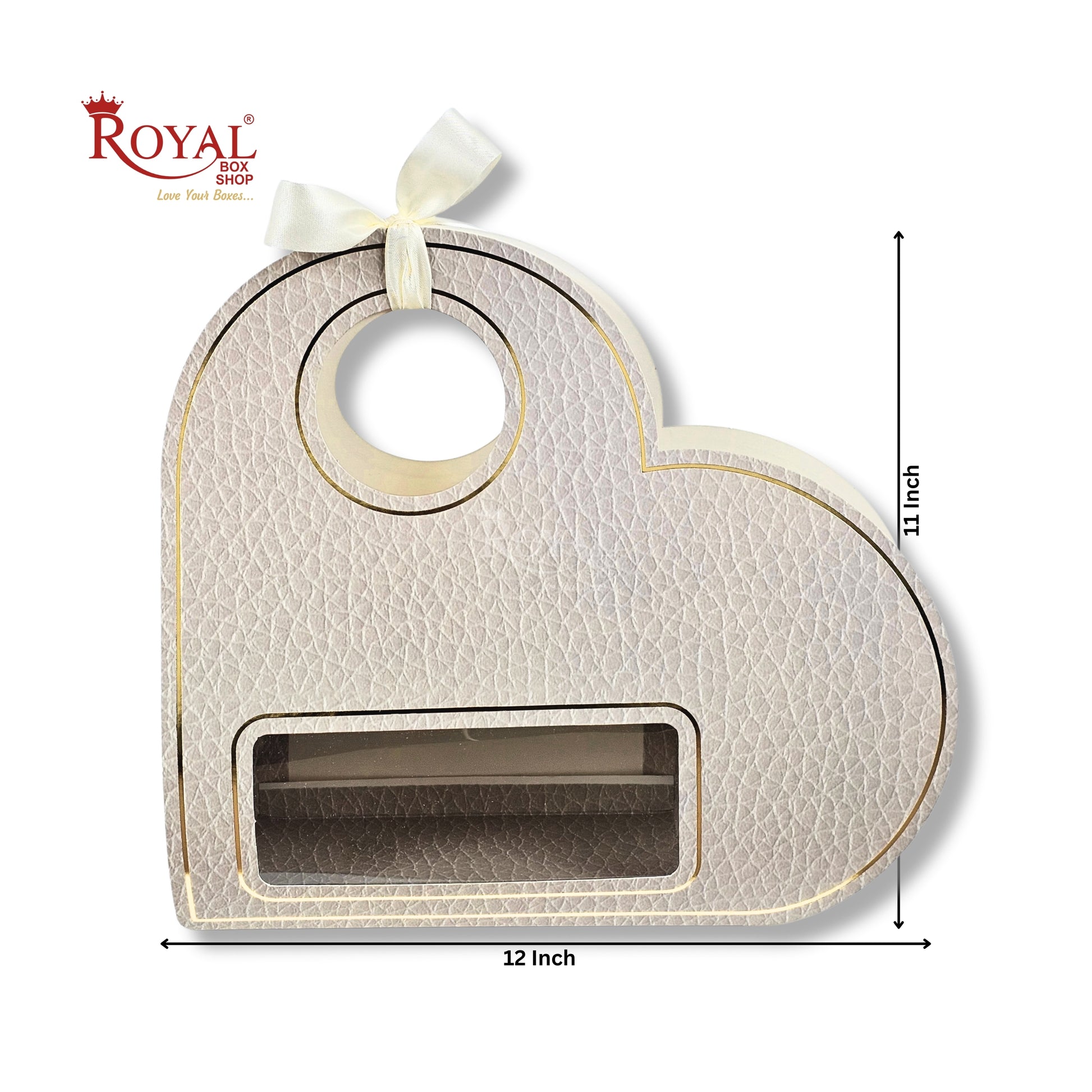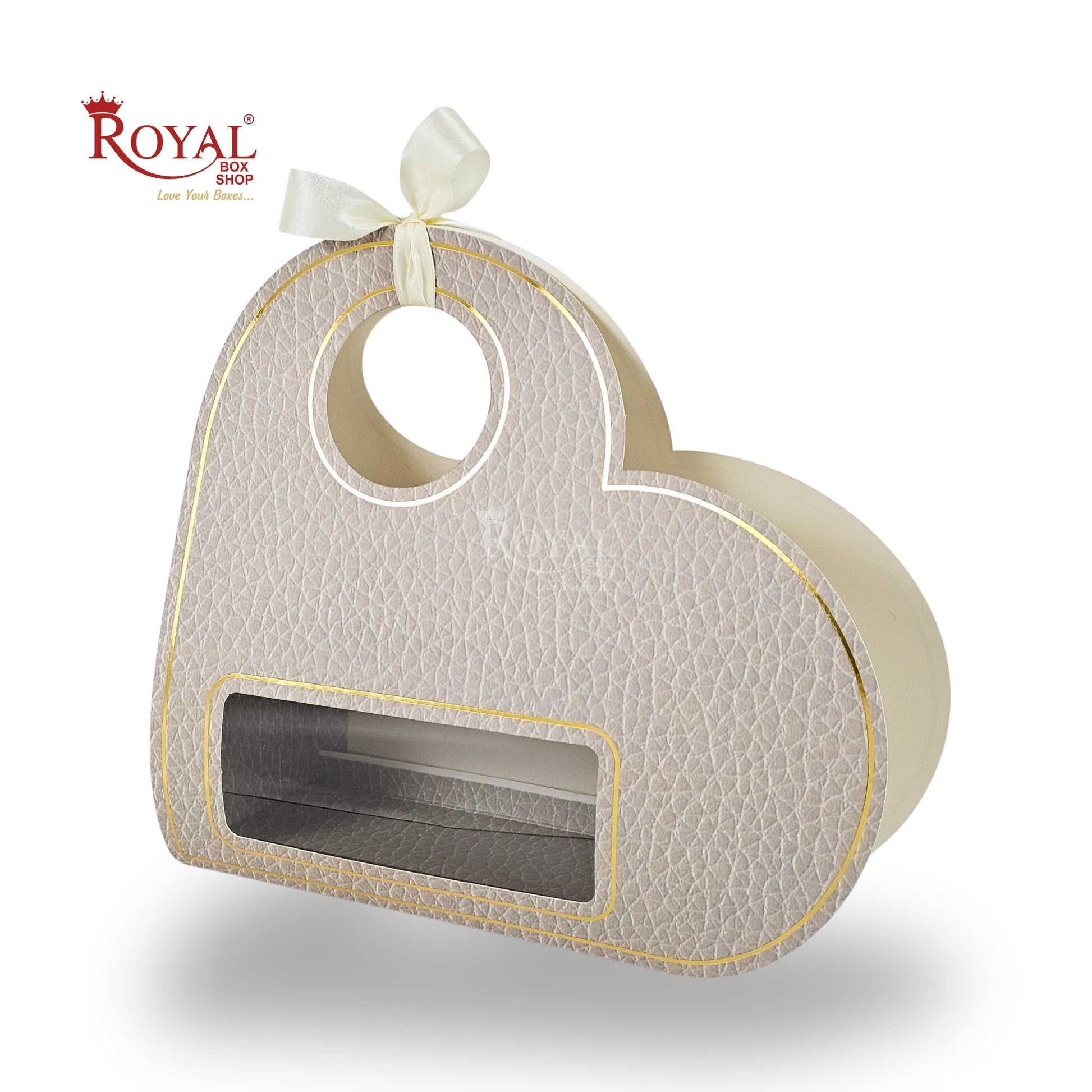 The RBF-65 Ivory Heart Shape Gift Hamper Bag from Royal Box Shop® combines elegance with practicality. Featuring a premium textured finish, gold-edge detailing, a ribbon carry handle and a clear front window, this hamper bag enhances the presentation of chocolates, sweets, cosmetics or luxury gifts. A perfect packaging solution for Valentine gifting, wedding favors, engagement hampers and boutique gifting.