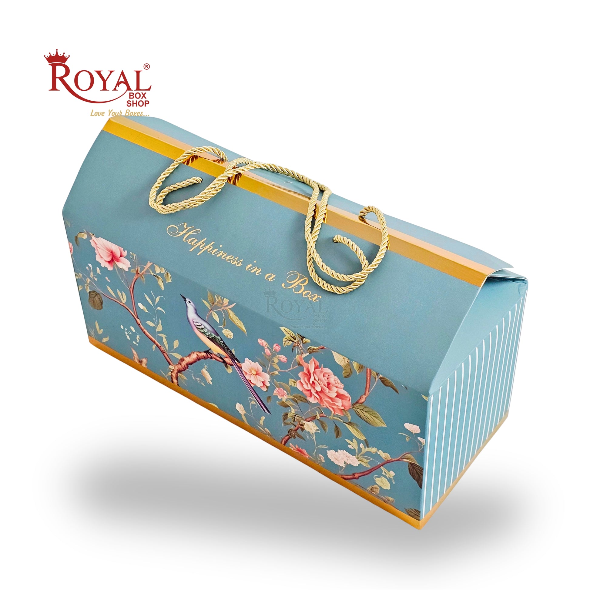 Featuring a charming bird and floral artwork on a soothing teal background, this luxury box is thoughtfully designed to hold chocolates, dry fruits, sweets, or return gifts. Finished with golden foiled borders and a soft satin rope handle, this box is the perfect fusion of traditional charm and modern flair.