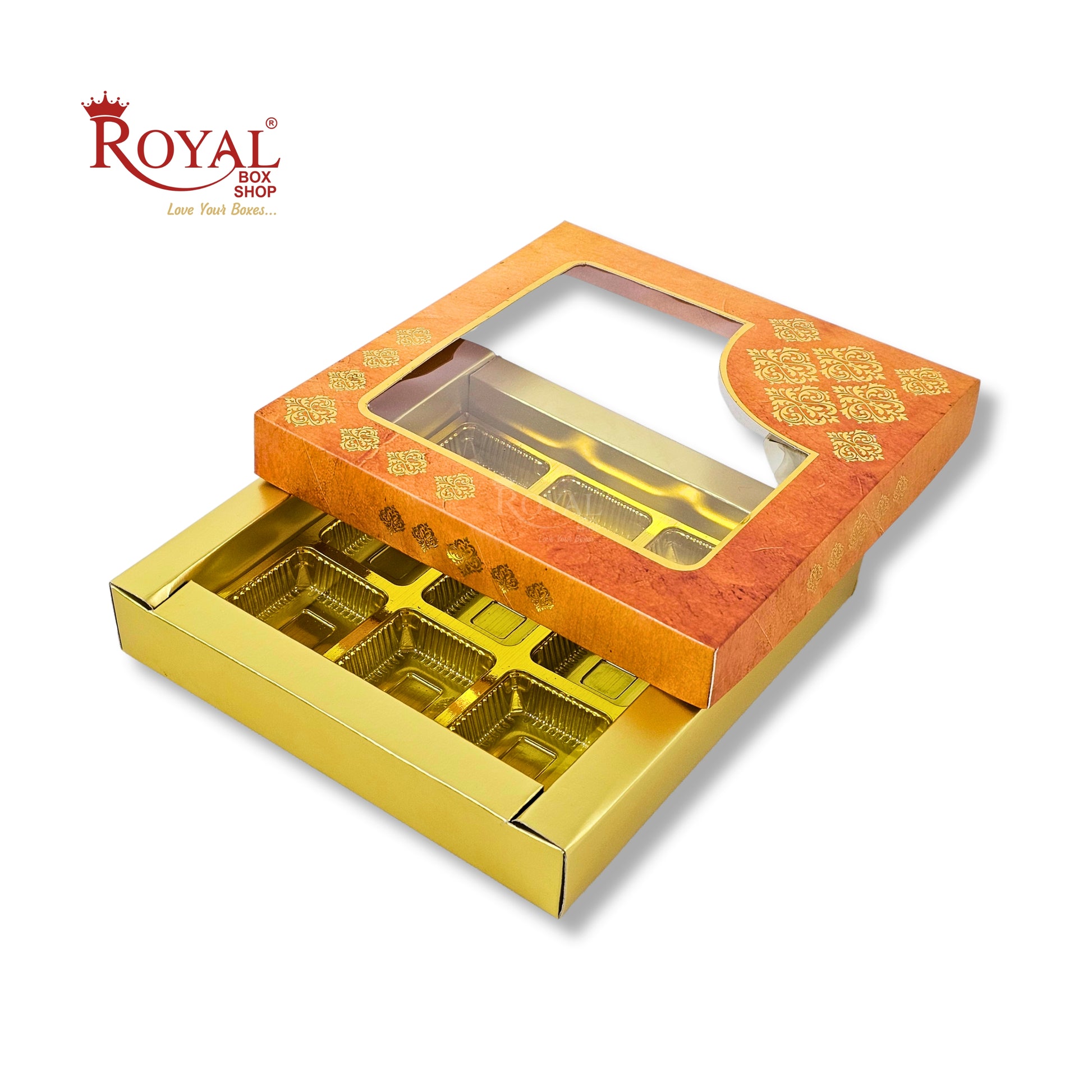 RoyalBoxShop® 9 Cavity Chocolate Box | RCH-09 D1 | Window Lid | Golden Tray